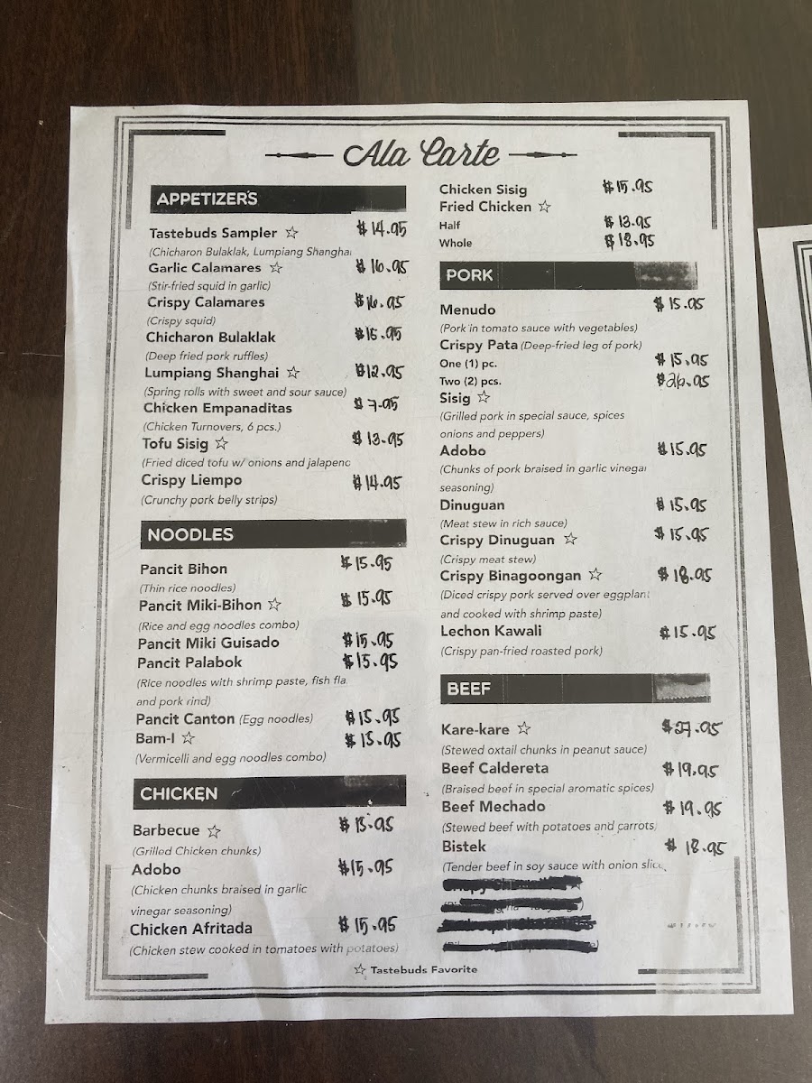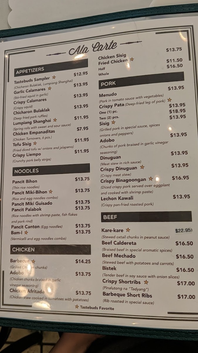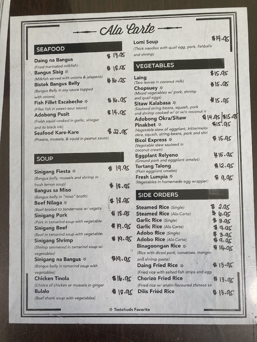 Tastebuds Lechon offers a delightful menu filled with a wide variety of flavorful Filipino dishes. For seafood lovers, the Fish Fillet Escabeche, Daing Na Bangus, and Bangus Sisig are must-tries, while the Bistek Bangus Belly adds a rich twist to the selection. Vegetables are well-represented with options like Laing, Tortang Talong, and the hearty Bicol Express. The menu also features comforting soups such as Sinigang Beef, Sinigang Shrimp, and the light yet flavorful Chicken Tinola. If you're craving something on the side, try their Adobo Rice, Chorizo Fried Rice, or the classic Garlic Rice. For a more substantial meal, dive into their selection of chicken, including the savory Adobo, smoky Barbecue, and flavorful Chicken Afritada. Appetizers like Crispy Calamares, Lumpiang Shanghai, and Chicharron Bulaklak are perfect for sharing. Meat enthusiasts can enjoy a variety of beef dishes such as Bistek, Kare-Kare, and Beef Caldereta, while pork options like Crispy Binagoongan and Crispy Pata provide an indulgent experience. Don’t miss the assortment of delicious noodles, including Pancit Canton, Pancit Bihon, and the ever-popular Pancit Palabok. With such an extensive and well-curated menu, Tastebuds Lechon truly delivers an authentic Filipino feast.