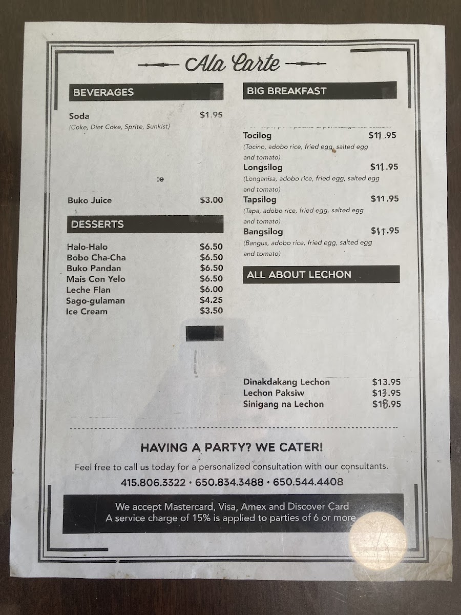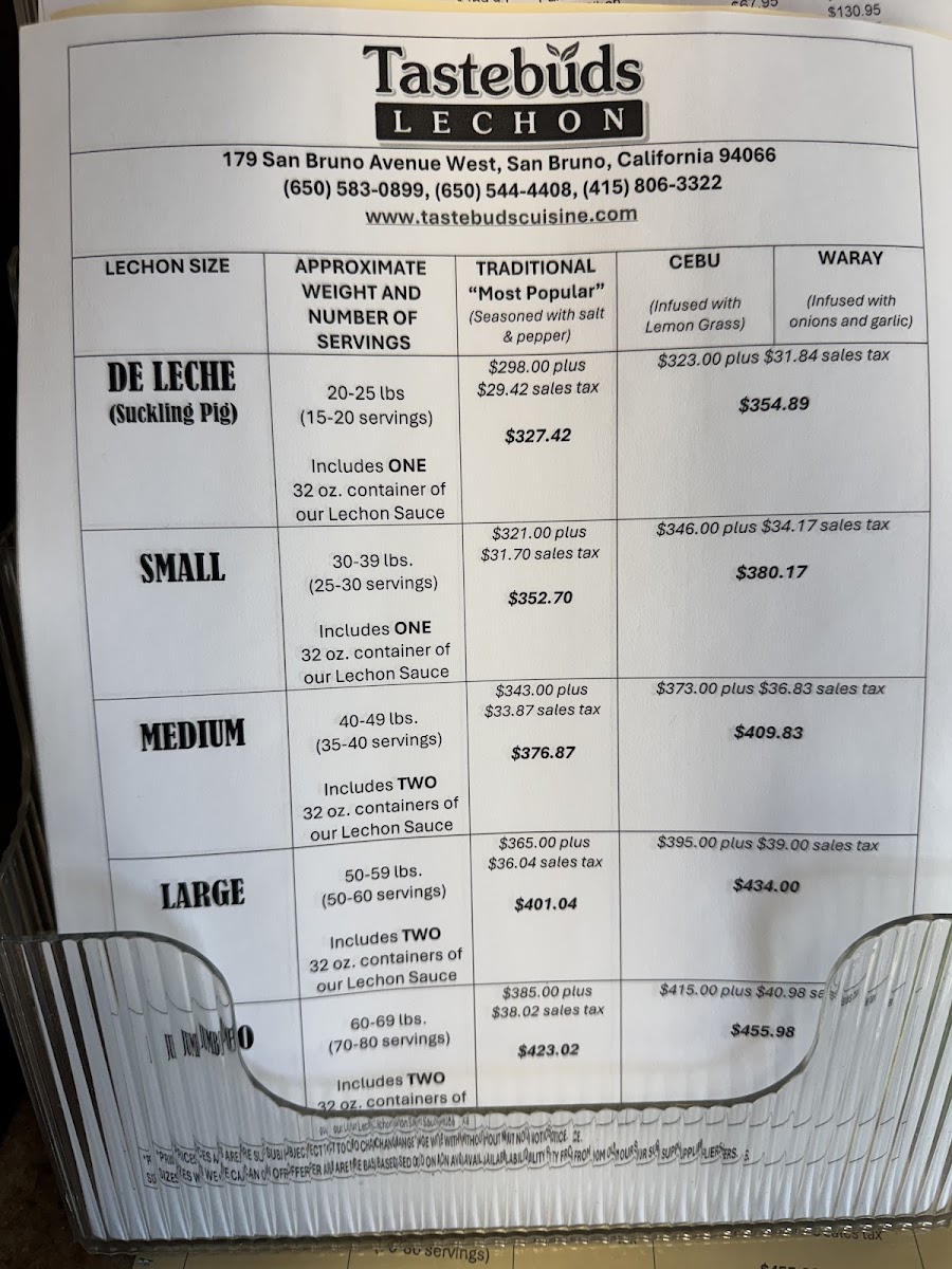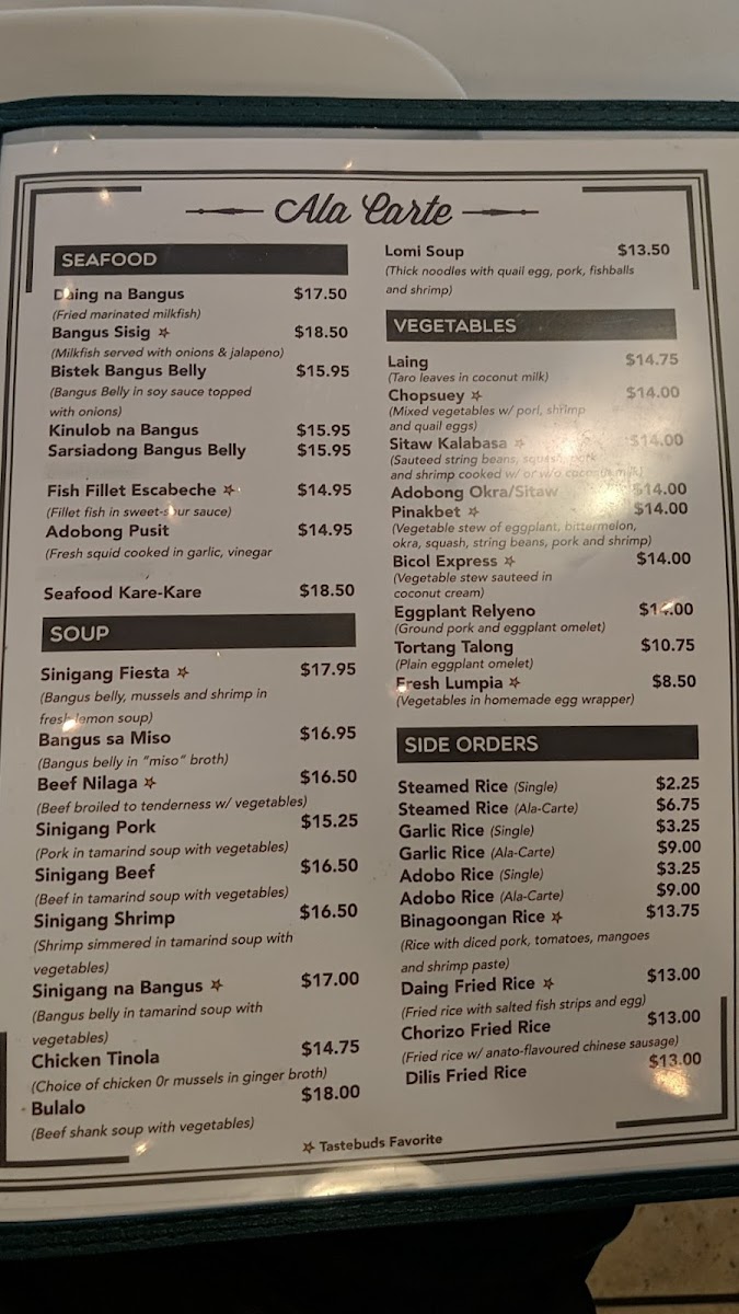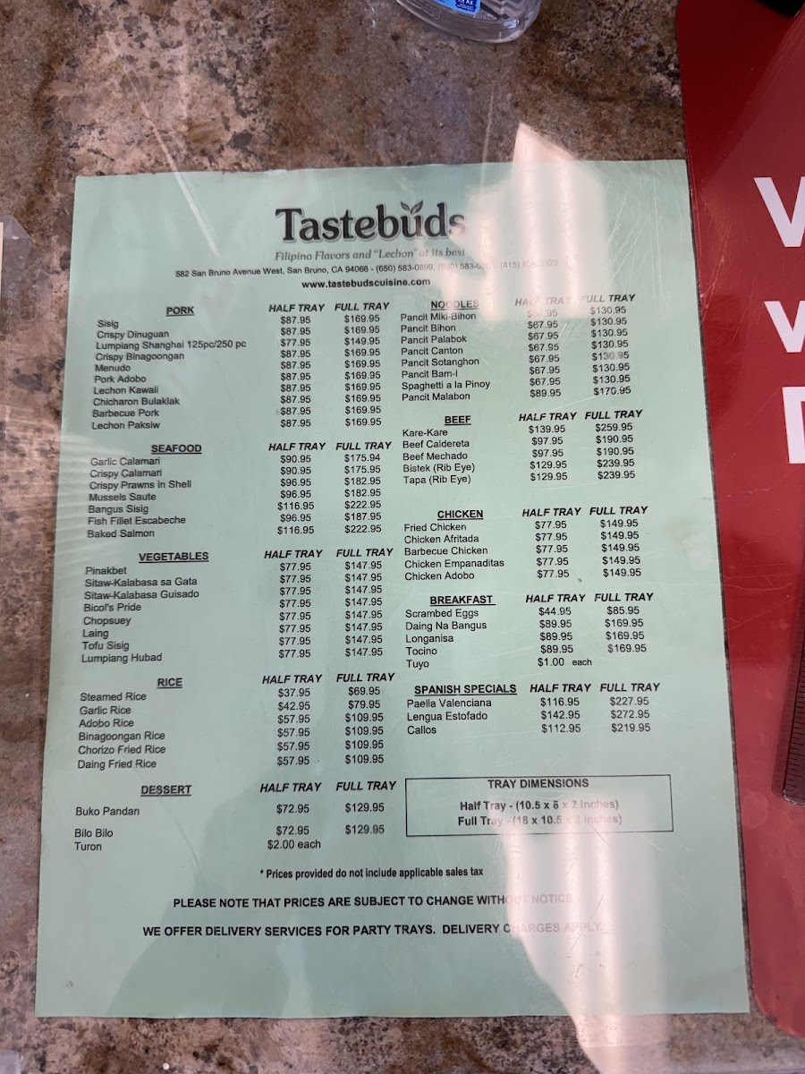 Tastebuds Lechon offers a delightful menu filled with a wide variety of flavorful Filipino dishes. For seafood lovers, the Fish Fillet Escabeche, Daing Na Bangus, and Bangus Sisig are must-tries, while the Bistek Bangus Belly adds a rich twist to the selection. Vegetables are well-represented with options like Laing, Tortang Talong, and the hearty Bicol Express. The menu also features comforting soups such as Sinigang Beef, Sinigang Shrimp, and the light yet flavorful Chicken Tinola. If you're craving something on the side, try their Adobo Rice, Chorizo Fried Rice, or the classic Garlic Rice. For a more substantial meal, dive into their selection of chicken, including the savory Adobo, smoky Barbecue, and flavorful Chicken Afritada. Appetizers like Crispy Calamares, Lumpiang Shanghai, and Chicharron Bulaklak are perfect for sharing. Meat enthusiasts can enjoy a variety of beef dishes such as Bistek, Kare-Kare, and Beef Caldereta, while pork options like Crispy Binagoongan and Crispy Pata provide an indulgent experience. Don’t miss the assortment of delicious noodles, including Pancit Canton, Pancit Bihon, and the ever-popular Pancit Palabok. With such an extensive and well-curated menu, Tastebuds Lechon truly delivers an authentic Filipino feast.
